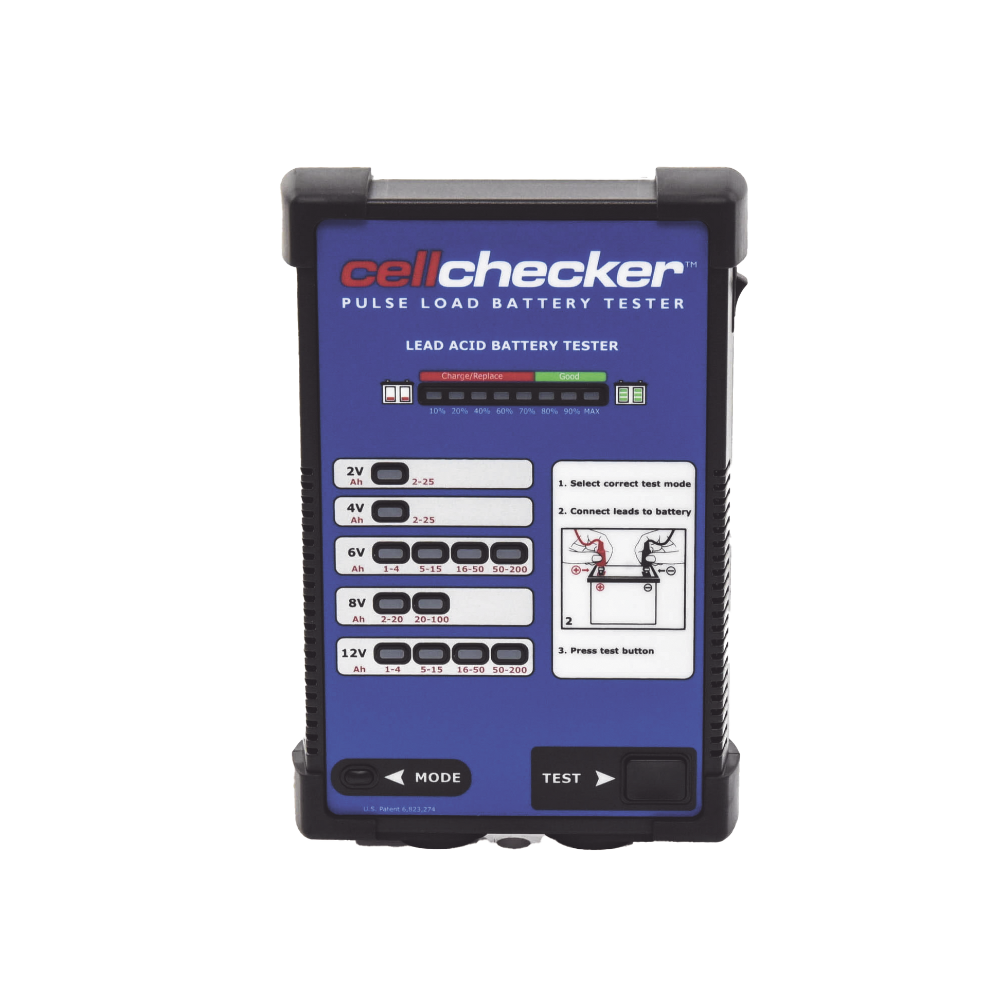 - Para probar baterías de: 2, 4, 6, 8 o 12 V, hasta 200 AH.